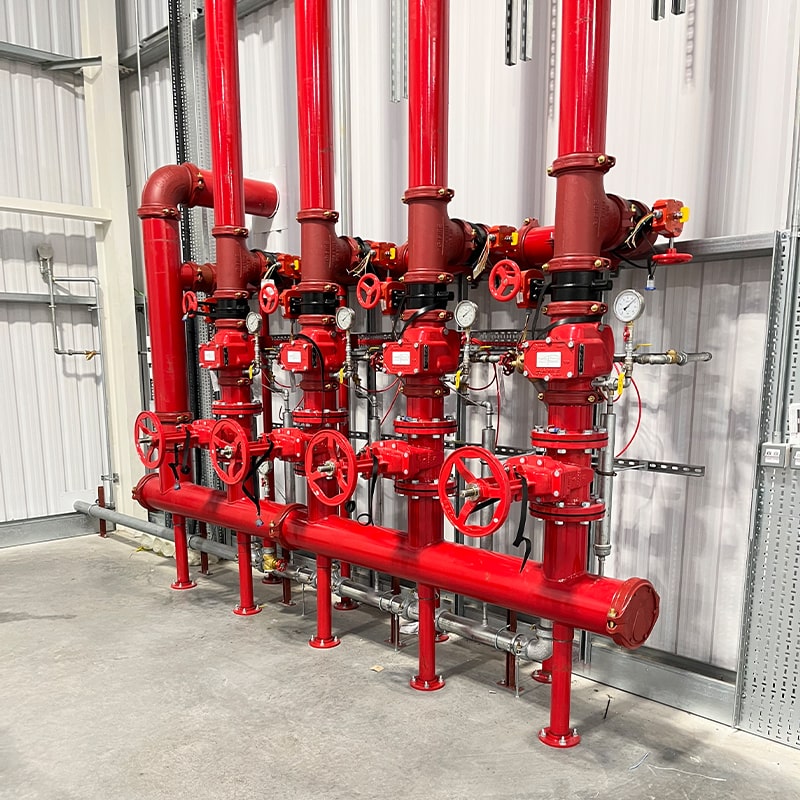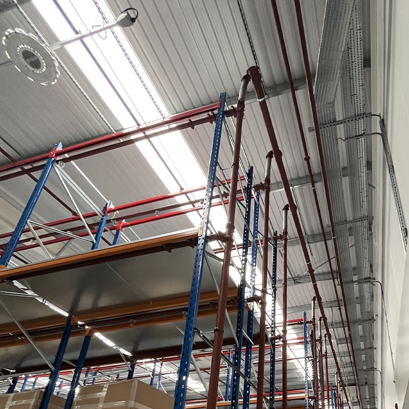 Design, supply, installation, testing & commissioning of a new automatic fire sprinkler system designed in accordance with NFPA 13 & NFPA 30 and insurer amendments. Roof design to NFPA 30 18.3mm/min over 270m² | Racks design to NFPA 30 Scheme B | Offices to NFPA 13 4.1mm/min over 139m². The system is suppliedby twodiesel fire pumps drawing water from two 500m³ capacity water storage tanks. The system is subdivided into four installations.