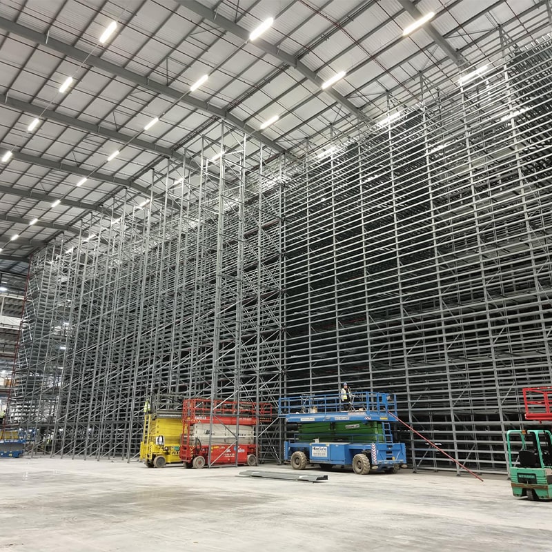 Design and installation of a fully automatic sprinkler system with 48 separate wet installations. Including roof, fully automated racking, five levels of mezzanine, offices, canopies, conveyor and chute protection plus a link bridge with an interlinking feed main to an existing project. Backed up by three half duty pumps rated at 8000 L/MIN @8.0 bar drawing water from two 1.4 million litre capacity tanks with the ability at the push of a button to activate and use the fire pumps and tanks from the existing project through an electrically actuated valve. An impressive 96,151 sprinkler heads have been installed with 62,578 of those in racking alone.