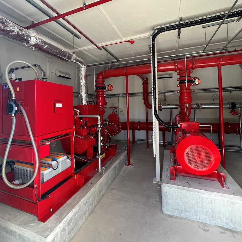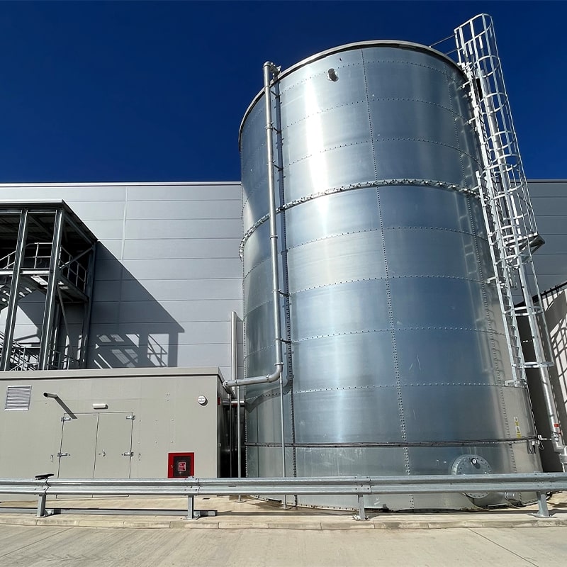 A mezzanine floor covering the entire building footprint with manufacturing space beneath, protection in this area designed for a High Hazard process 2 occupancy with a 10mm/min over 260m². A further section below the mezzanine is protected using TB209 ESFR protection above large block storage this design is based upon 12 ESFR heads operating at 2.4bar. Office space design to Ordinary Hazard Group 1 5mm/min over 72m². The system is fed from a new High Hazard water supply comprising of water storage tank with diesel & electric fire pumps operating on a duty & standby basis.
