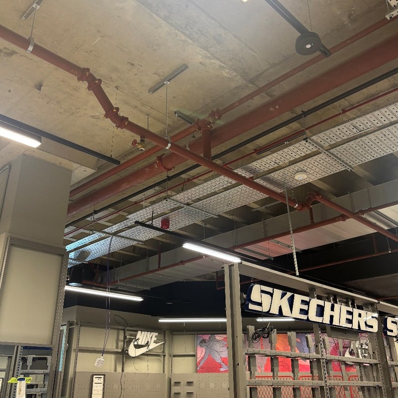 The project consisted of designing a combination of false ceiling, false ceiling void and exposed soffit mounted sprinklers throughout the ground and first floor, at the clients request the pipework was sprayed in bespoke finishes.